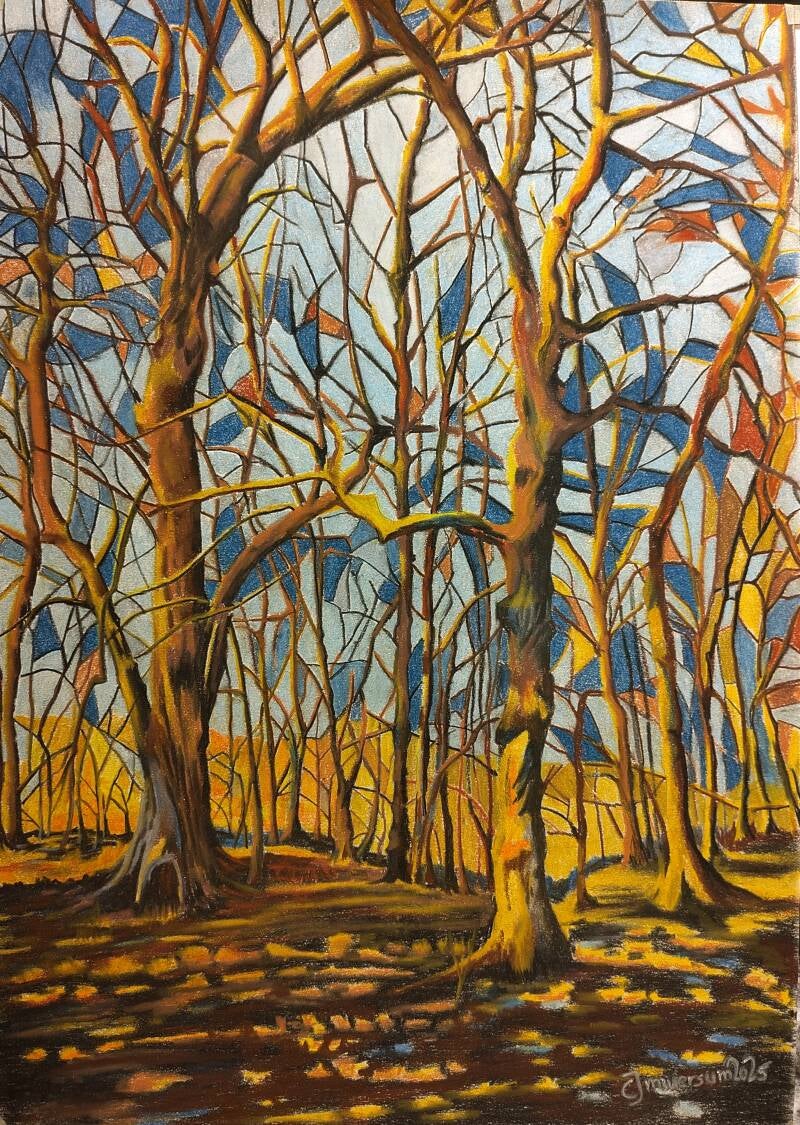 Een op het oog normaal bos, ergens in de late herfst. Maar wie goed kijkt ziet de gelijkenis met gebrandschilderde ramen...