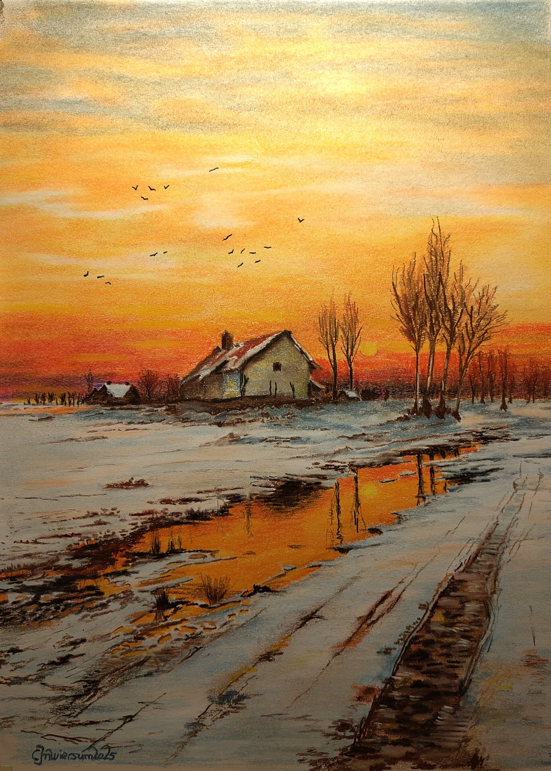 De winteravond valt boven een boerderij. Het is origineel een werk van een vrij onbekende kunstenaar Tibor Szuchán. De kleuren spraken mij zo aan dat ik wel móest proberen dit schilderij na te tekenen.