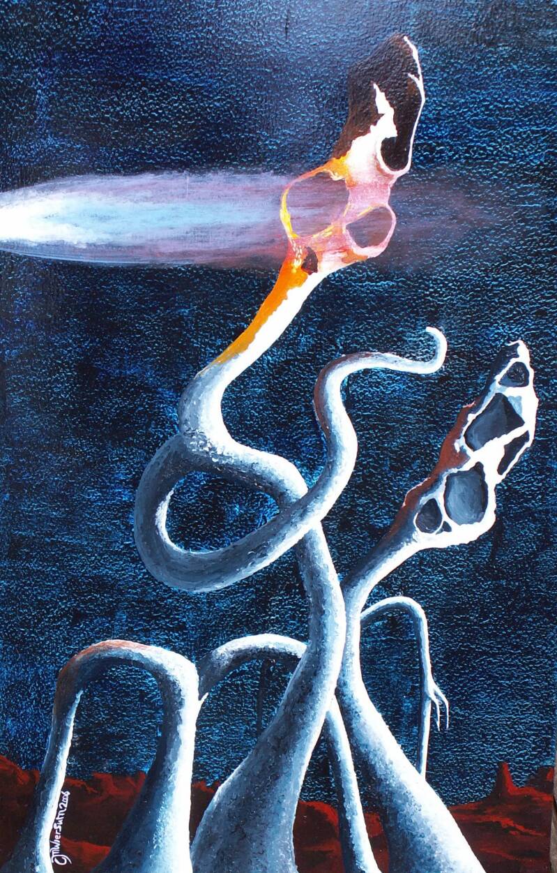 Tijdens een vakantie te Ommen vonden we een levensechte pop, achtergelaten op zeer grillige wortels van een boom. Het geheel deed zo vreemd en beladen aan dat ik er een aantal foto's van genomen heb en aan de hand daarvan dit schilderij maakte.