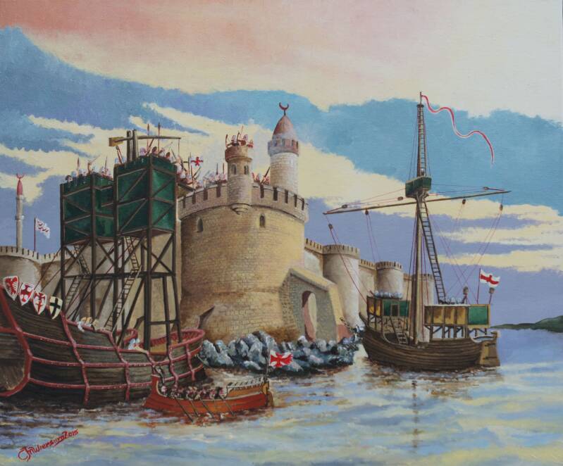 Fictief geschiedkundig tafereel. Een aantal middeleeuwse schepen doen een aanval op een stad uit ergens in het Midden Oosten. Deze slag staat bekend als de slag om Damiate door Haarlemse kruisvaarders; deze slag heeft echter nooit plaatsgevonden.