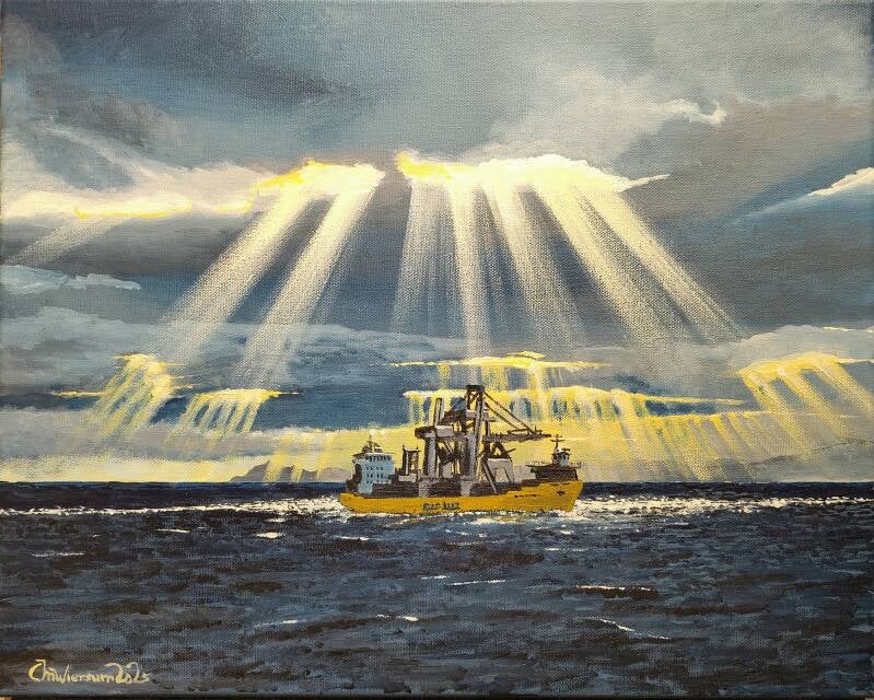 Naar een foto uit een serie, genomen door mij op de Noordzee. Het betreft het m.s. Bloemgracht tijdens een SW-lijke storm in 1995. Het schilderij laat, wanneer op zijn kop geplaatst, zien waar deze storm over het zuidelijke deel van de Noordzee verplaatste.