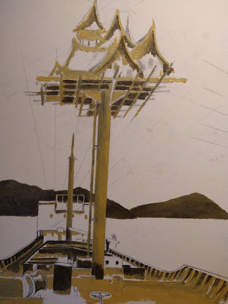 6. Het schilderij begint een eenheid te worden. Wat hogere bebouwing aan de linkerkant correspondeert straks met het tuigage van het schip.